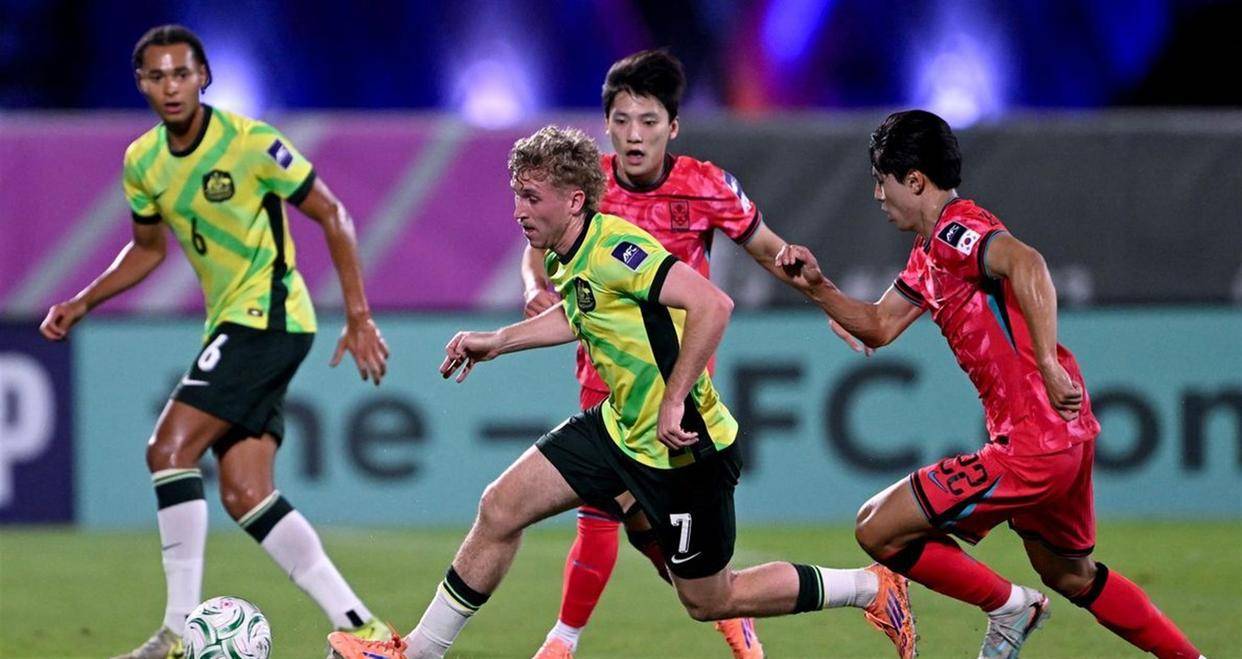 另一场同时进行的比赛中,韩国队遭遇了澳大利亚队的顽强抵抗。 韩国队在第22分钟率先打破僵局。 一次后场的精准长传找到了前插的白佳温,他在禁区边缘不等皮球落地,直接凌空抽射破门。 这个进球体现了韩国队简洁高效的进攻思路。