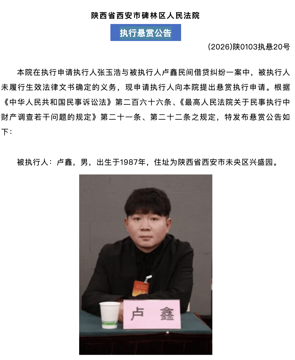 2月11日17时54分,西安市碑林区人民法院微信公号发布执行悬赏公告(2026年第5期),将被执行人卢鑫的照片头像、身份证号码前14位、住址等信息公布,该案执行案号为:(2025)陕0103执5553号,执行标的为20万元。
