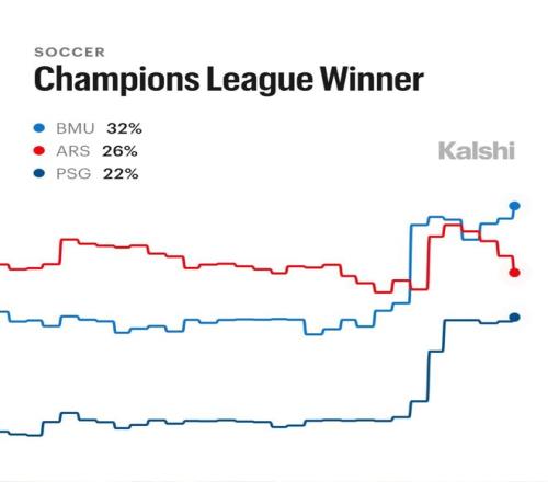 半岛体育,半岛体育官方网站,半岛体育APP下载32%的夺冠概率,拜仁慕尼黑在Kalshi预测市场上反超阿森纳。更离谱的是,皇家马德里6%垫底——这支14冠球队比巴萨还低1个点。
