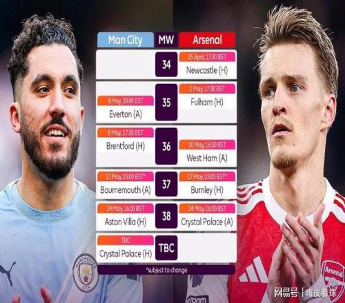 剩余的赛程,两队各有5场,均为3个主场,2个客场,阿森纳的对手包括纽卡斯尔、富勒姆、西汉姆、伯恩利和水晶宫,曼城则有埃弗顿、布伦特福德、伯恩茅斯和阿斯顿维拉,以及等待确定开赛时间的水晶宫。