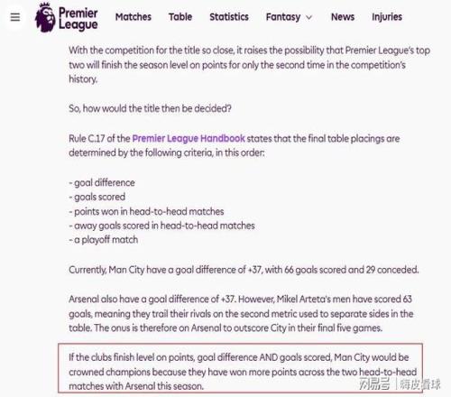 显然,无论是积分,还是进球数和失球数,曼城和阿森纳都是相当接近的,38轮比赛结束后,完全有可能出现积分相同,净胜球相同,进球数也相同的情况。英超官方指出,如果三项数据均一样的话,接着会比较对赛成绩,曼城凭借一胜一平的优势,成为冠军,阿森纳只能屈居亚军。